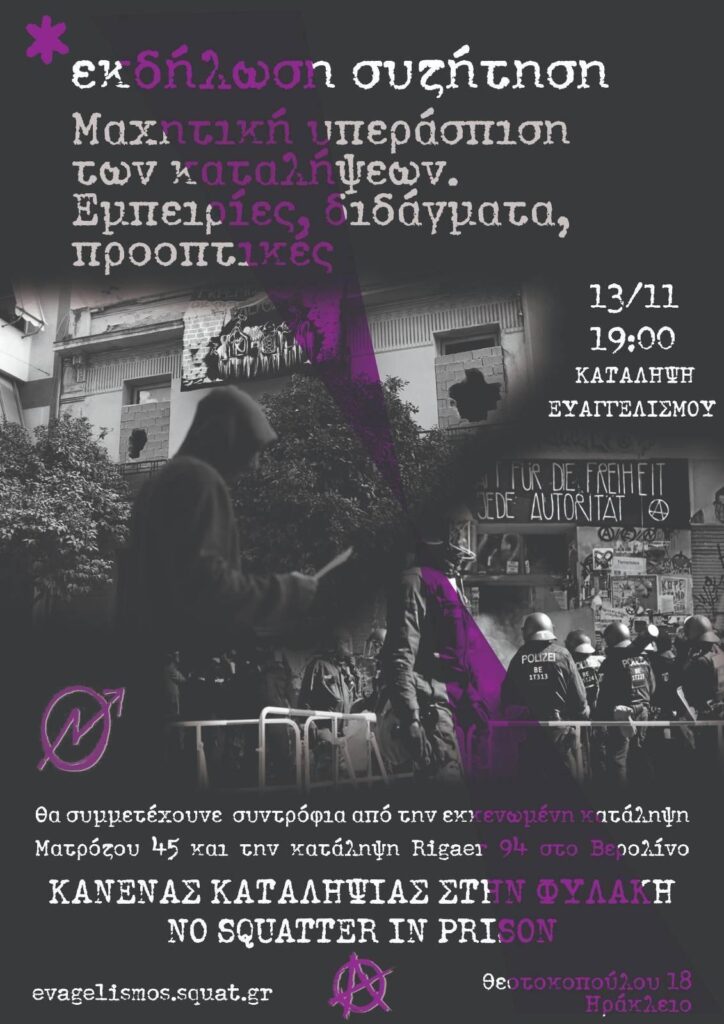 Εξ’ αφορμής αυτού και μετά της τρίτη ανακατάληψη της Κατάληψης Ευαγγελισμού, θα πραγματοποιηθεί εκδήλωση με την συμμετοχή συντροφιών από την εκκενωμένη κοινότητα καταλήψεων Κουκακίου και την Κατάληψη Rigaer 94 στο Βερολίνο. Οι δύο αυτές καταλήψεις έχουν σαν κοινό, την μαχητική υπεράσπιση τους απέναντι στις εισβολές των μπάτσων. Για εμάς είναι σημαντικό οι εμπειρίες αυτές, καθώς και κάθε εμπειρία μαχητικής υπεράσπισης των καταλήψεων, να γίνεται συλλογική μνήμη και σημείο εκκίνησης για το μέλλον. Τα έσοδα από το καφενείο της Παρασκευής 14/11 θα δοθούν για τα δικαστικά έξοδα της Ματρόζου 45.