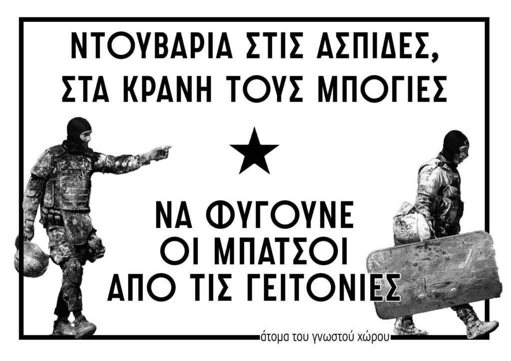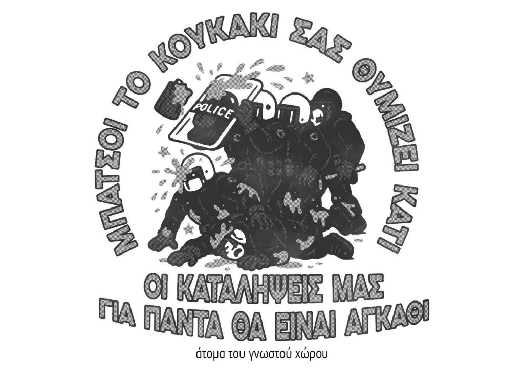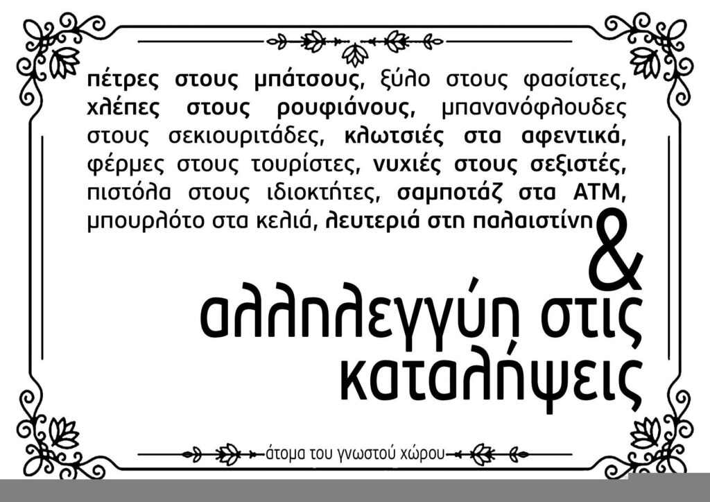 …Τώρα ανοίγουν τα πανό τους οι αγωνιζόμενοι/ες. Κοιτιούνται στα μάτια, χαμογελάνε και όλοι/ες μαζί αντιστέκονται σε αυτόν τον ρημαγμένο κόσμο. Βγαίνουν στους δρόμους, σαμποτάρουν τις εμπορευματικες ροές, υπερασπίζονται τις καταλήψεις, τις σχέσεις, τις συγκινήσεις τους.