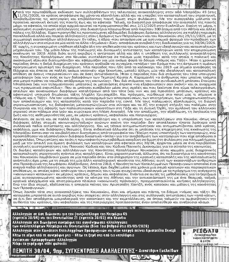 Αλληλεγγύη σε όσα διώκονται για την (ανα)κατάληψη της Ματρόζου 45 (εφετείο 30/04) και της Παναιτωλίου 21 (εφετείο 30/03) στο Κουκάκι
