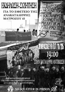 Παρασκευή 7/11 στις 7 μ.μ. θα πραγματοποιηθεί εκδήλωση στην κατάληψη Αντιβίωση με διωκόμενα συντρόφια από την κοινότητα καταλήψεων Κουκακίου ενόψει του εφετείου για την εκκένωση της ανακατάληψης της Ματρόζου 45 που έχει οριστεί για την Τρίτη 2/12.