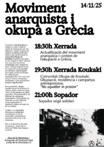 Fem un edeveniment informatiu i solidari el pròxim 14 de novembre, a Kasa de la Muntanya on dues companyis d’Atenes faran una actualització d’aquesta campanya antirepressiva, una presentació del que va ser la Comunitat Okupa de Koukaki i una xerrada de la situació actual del moviment anarquista i okupa a Grècia.