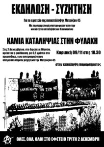 Την Κυριακή 9 Νοέμβρη θα γίνει εκδήλωση – συζήτηση με τα συντρόφια από την κοινότητα καταλήψεων κουκακίου, σχετικά με την εκκένωση της κατάληψης Ματρόζου 45, και το επερχόμενο εφετείο το οποίο είναι προγραμματισμένο για τις 2 Δεκέμβρη στην Αθήνα.